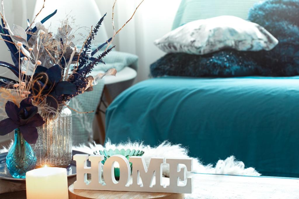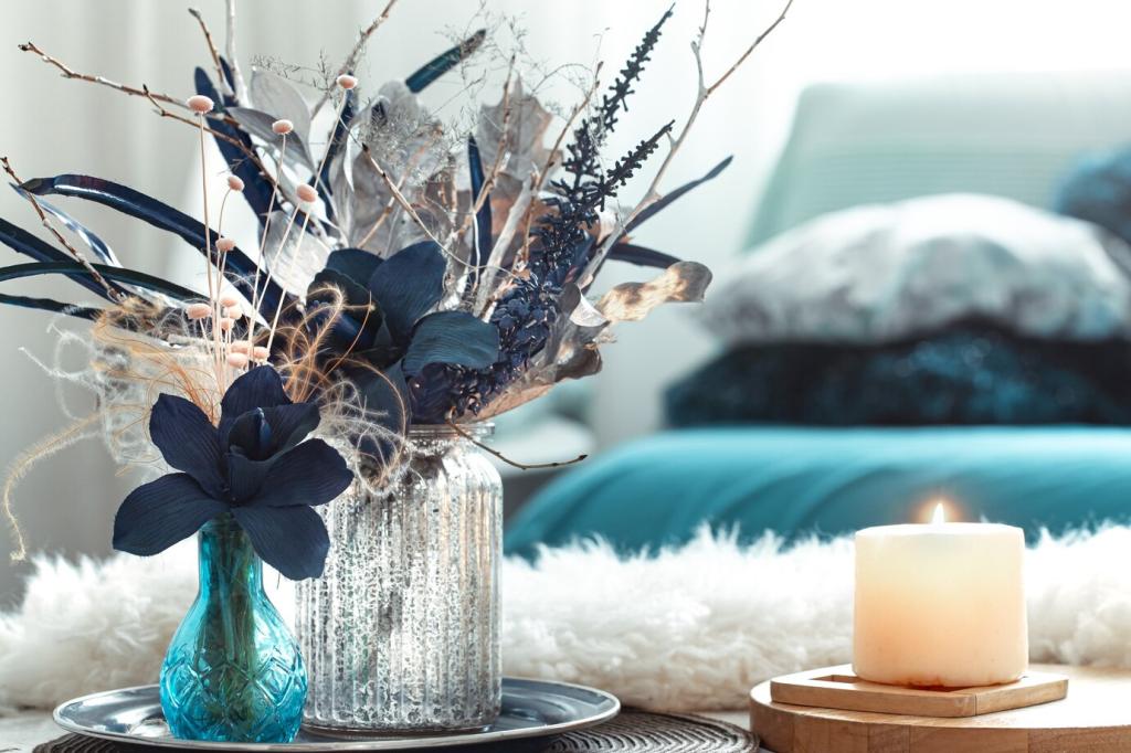 Glattes Glas neben offenporigem Holz, matter Ton zu glänzendem Metall: Gegensätze lassen Flächen lebendig wirken. Drei dominante Texturen reichen, sonst entsteht Unruhe. Fotografieren Sie Ihr Material-Trio und teilen Sie es zur Diskussion.